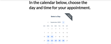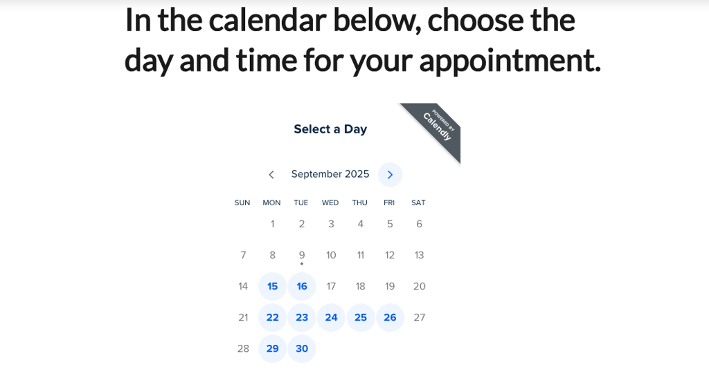 On this same page, you’ll find a calendar where you can select the date and time of your appointment.